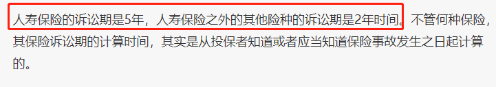 另外要注意的是,不同险种的诉讼期不太相同,寿险产品的诉讼期有5年,而其他险种的诉讼期只有2年。
