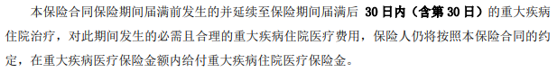 比如医疗险,如果在保障期限内出险,那么在保险期间届满后的30天内产生的医疗费用仍旧可以被报销:
