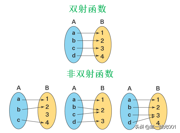 从上面的双射函数的例子,我们可以观察到每个元素B的一组不同的元素的相关非双射函数有一些元素B在设置一个没有原像,或一些元素组B是多个元素集的图像。