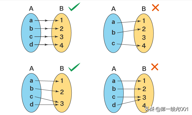 在上面的函数例子中,在集合B中没有任何剩余元素的函数是一个满射函数。在一个满射函数中,集合B的每个元素都是从集合a的一个或多个元素映射而来的。另外,非满射函数在集合B中的元素也没有从集合a的任何元素映射而来。