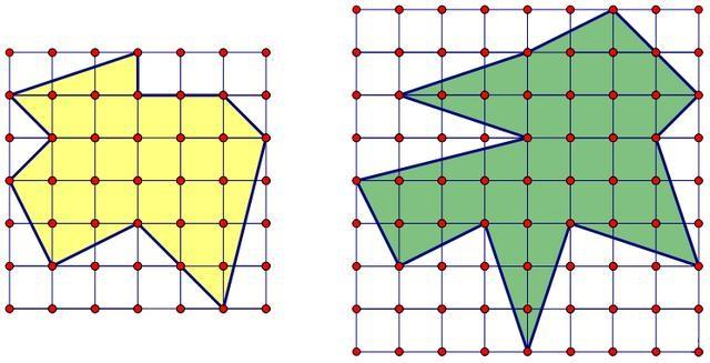 它们有相同数量的边界点,但是它们的体积却并不相等,前者是,后者是 但是高维格点的研究并没有就此止步,埃哈特(Ehrhart)在1962年将皮克定理推广到高维空间,我们今后有机会为大家介绍。