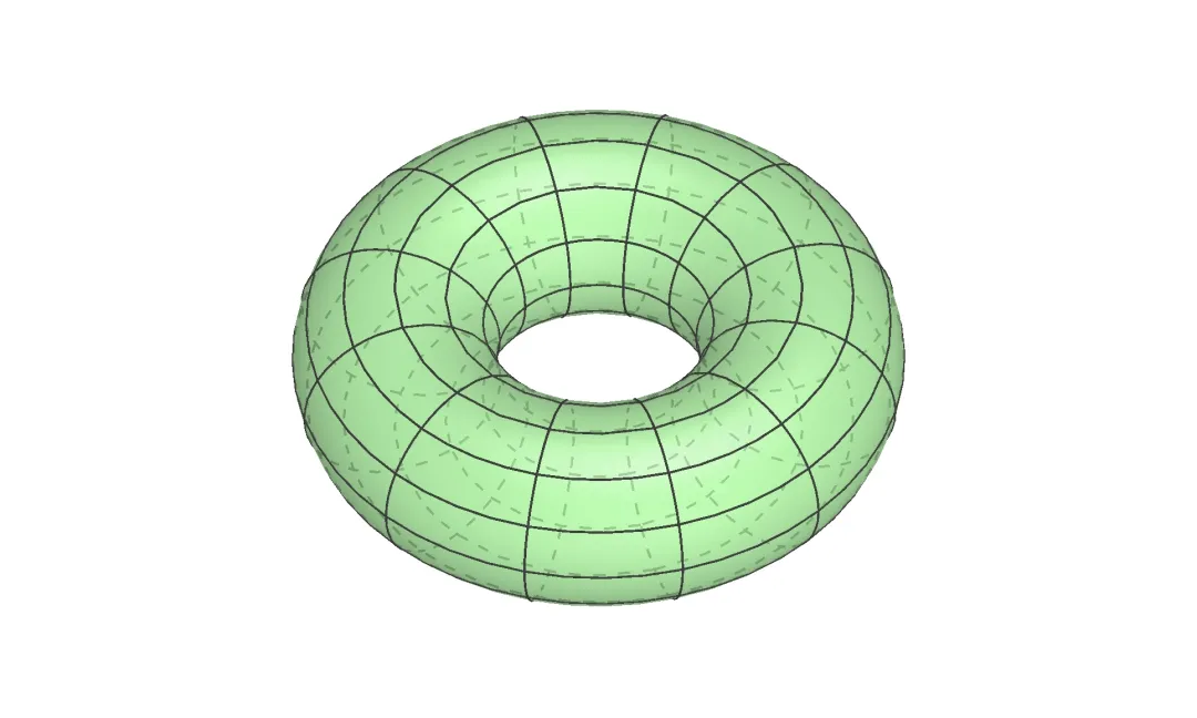 其中,表示有个“洞”的可定向闭曲面,例如图1中的圆环面,它只有一个“洞”,即。“洞”我们有个专有名词——亏格,我们下文仅仅需要用到亏格为的情况。公式中分别表示曲面上剖分的顶点数、棱数、面数。如图3,就是对圆环面的剖分;足球,则是用五边形与六边形对球面剖分。可定向闭曲面欧拉公式揭示了欧拉特征与曲面亏格之间的关系,这是数与形的美妙联系。