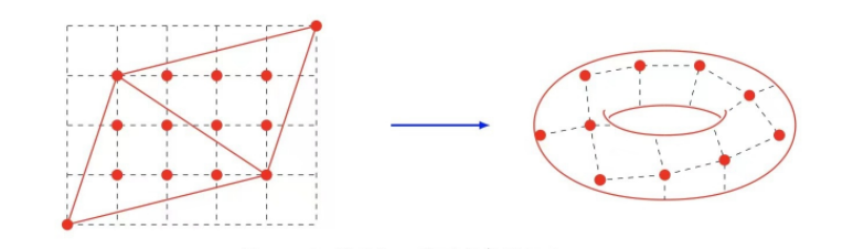 :平行四边形所有的边界点化为圆环面的内点——个角点化为个内点,非角点边界点自我重合减半,故而圆环面的顶点个数: