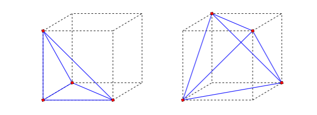 遗憾的是,皮克定理不能直接推广到高维的情况,也就是说:我们不能通过高维格点多面体的内点、边界点而计算其体积。如下图,位于单位正方体内的两个没有内点的四面体,
