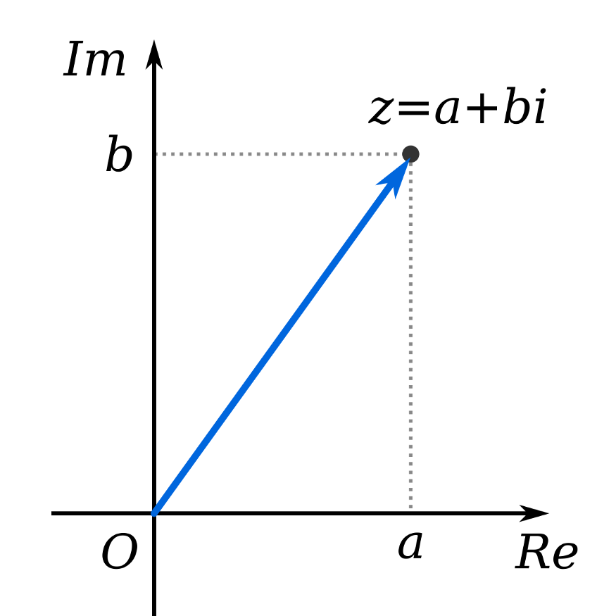 复数可以绘制在一个矩形网格上,类似于实数对(x,y)被绘制在一个直角坐标系统上。你可以简单地用一对实数(x,y)来确定复数z=x+iy,并绘制(x,y)。y轴称为虚轴,x轴称为实轴。