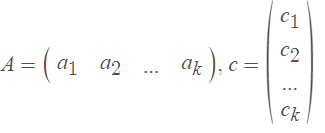 但我们可以把上式重写为矩阵向量的形式,为此,定义一个矩阵A,它的列是向量a_1,a_2,…,a_k,它的项的权值是c_1,c_2,…,a_k。因此: