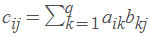 如果A是m×q矩阵,元素为a_ij ;B是q×n矩阵,元素为b_ij,那么乘积C=AB是m×n矩阵,c_ij为: