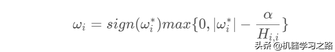 通过上图可以发现,当ωi与ω∗异号时,无论是哪种情况为了使得损失函数最小,其最优值都是ωi=0此时能保证代价函数的二次项式和绝对值式都取得最小值。当ωi和ω∗同号时,可以将上式进行化简可得