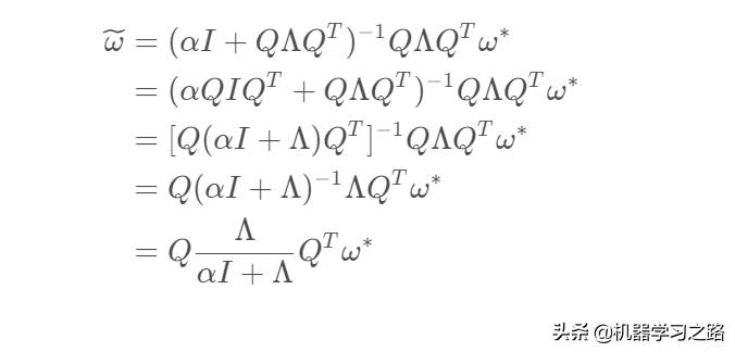 上式中的I表示的是单位矩阵,通过上式不难发现,当正则化的惩罚项系数α为0时,此时ω˜的最优解就等于ω∗,接下来我们讨论一下当惩罚项系数不为0的时。因为H是J在ω∗的Hessian矩阵,所以H是一个对称矩阵,我们可以对其做特征分解,可得H=QΛQT(后面是Q的转置),其中Λ为对角矩阵,Q为一组特征向量的标准正交基,代入上式可得