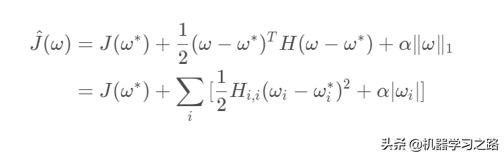 我们将J(ω;X,y)使用二阶的泰勒展开式来代替,可以将L1正则化后的代价函数转换为如下形式