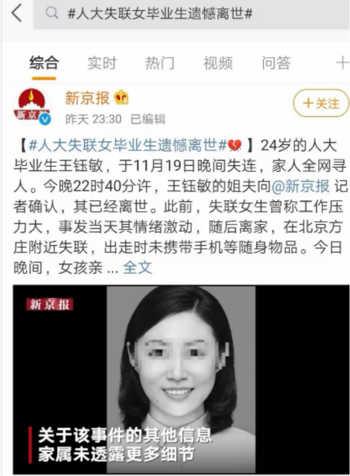 人大24岁女硕士王钰敏就是悲剧之一,拥有高等学历,却不具备同样高度的心理承受能力,以轻生的方式结束了生命,用她的话说,即放过自己。