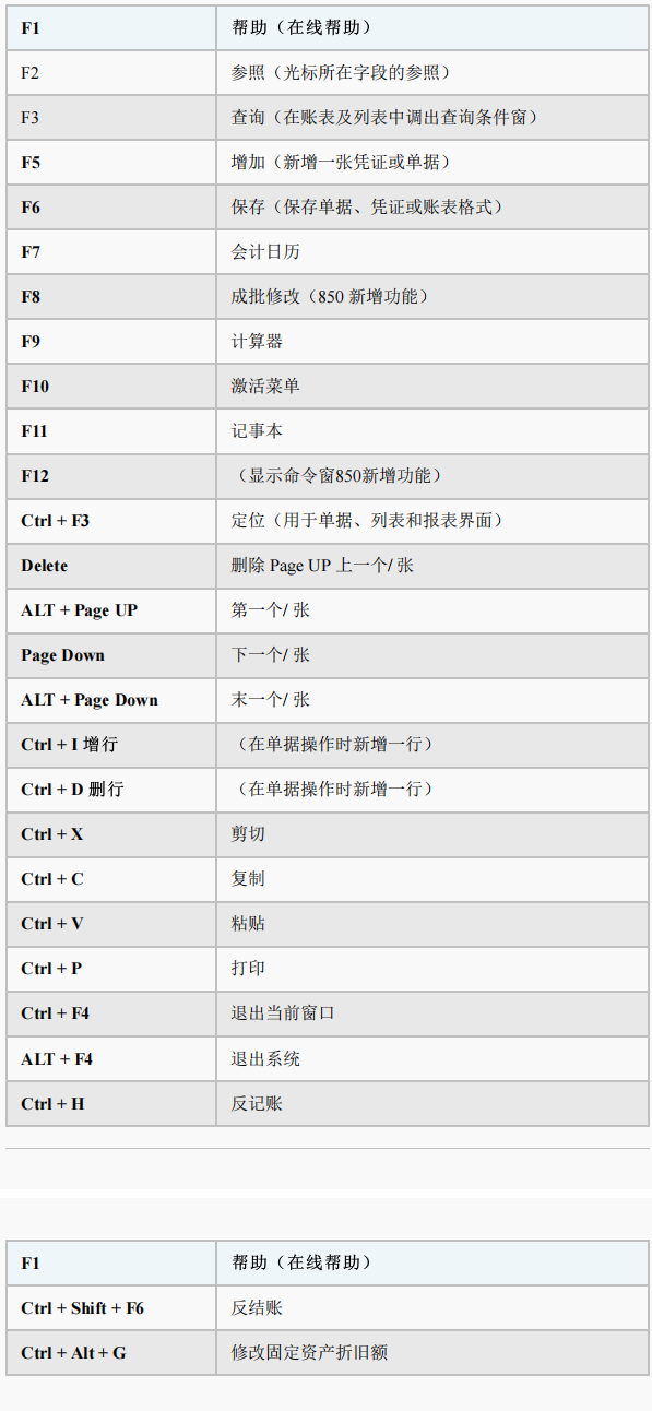 用友财务软件操作快捷键大全