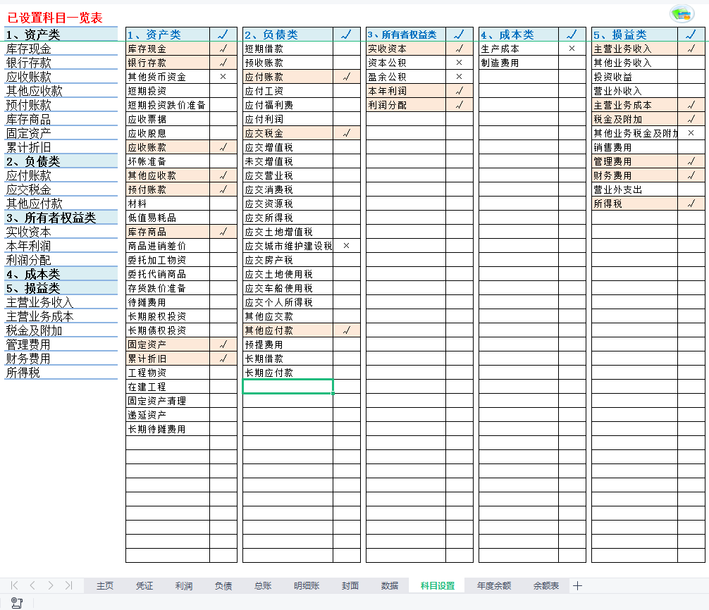 会计科目表可自行添加和设置。