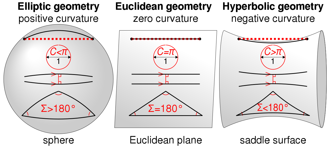 ▲ 椭圆几何、欧氏几何和双曲几何比较(图自维基@Cmglee作品)