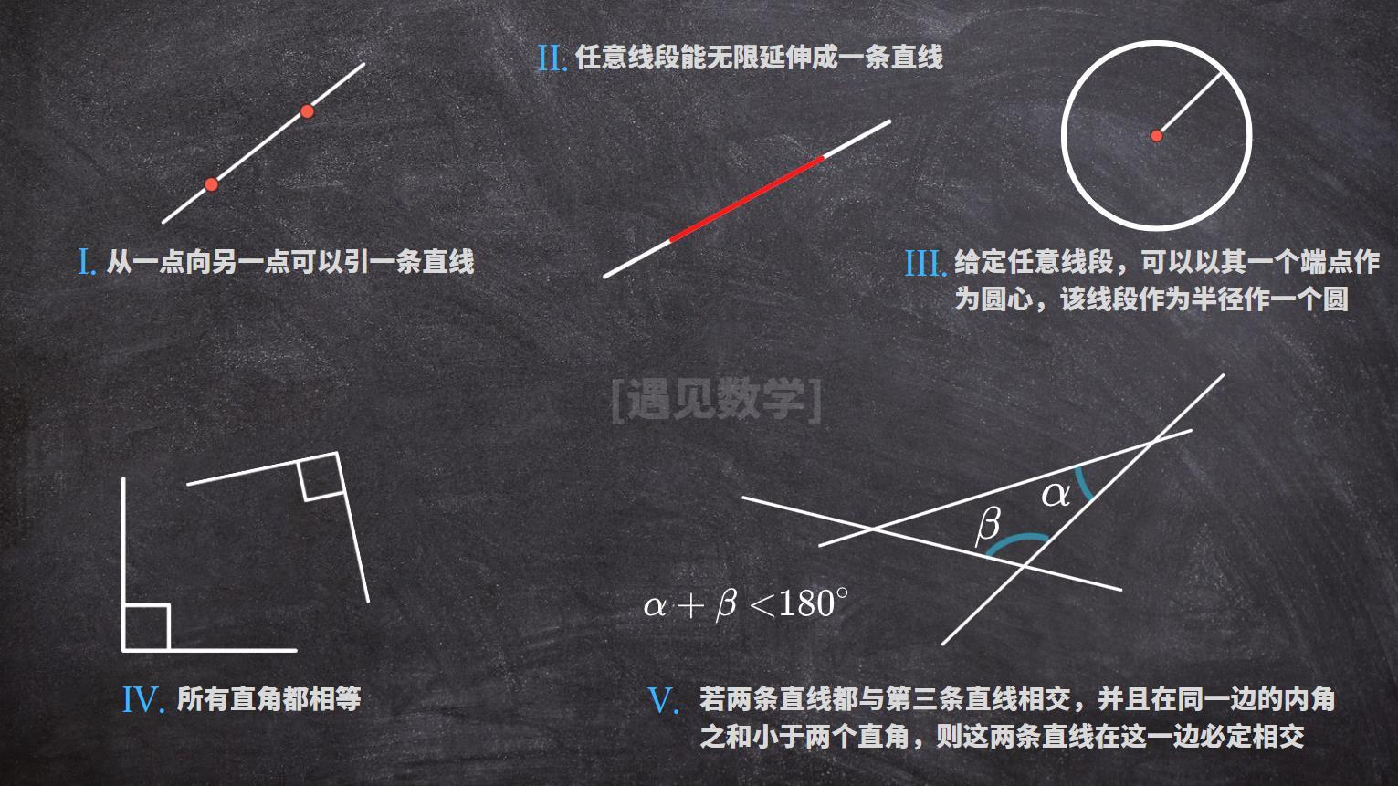 其中包括第 5 条公理又称为平行公设,它并不像前面四条公理那么简单明了,等价这个说法:三角形内角加起来等于 180°。这样的话,如果给你一个三角形中的两个角的大小,就可以利用一个平面中三角形内角和等于 180° 这一事实推断出第三个角的大小。