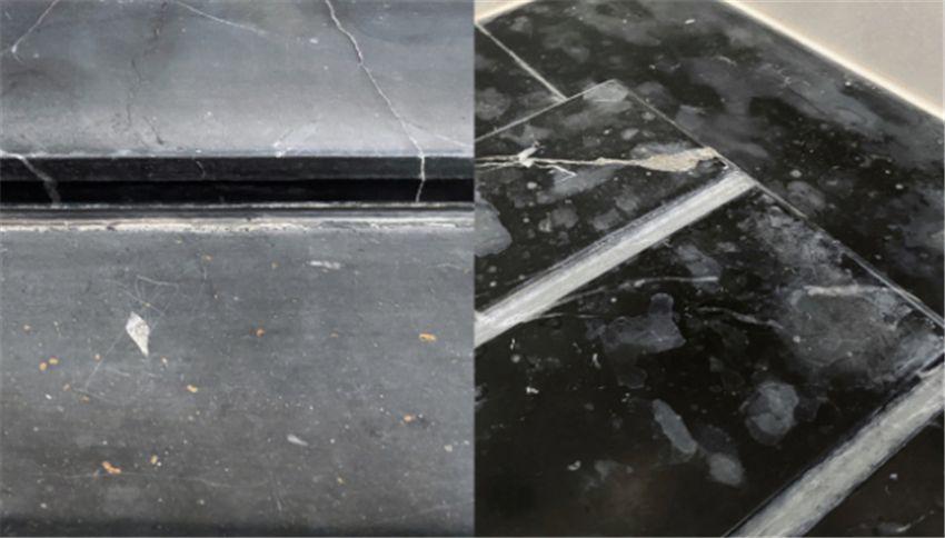 大理石渗色、吸水严重,长期在潮湿的环境下,肯定会堆积水垢;