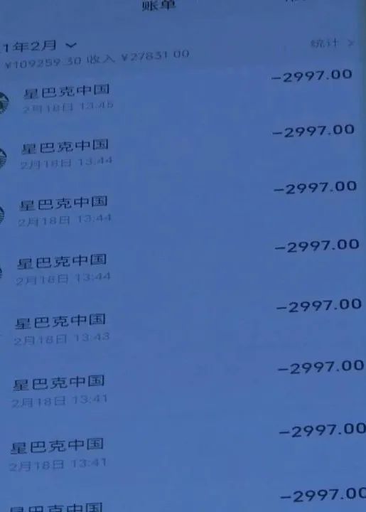 宋女士手机支付记录显示,从2月18号中午1点34分到3点15分,不到两个小时,手机完成了30笔支付和贷款。其中,在“星巴克中国”上消费了近九万元购买星巴克星礼卡,其余10多万元均从宋女士微信以及支付宝花呗、借呗中转出。