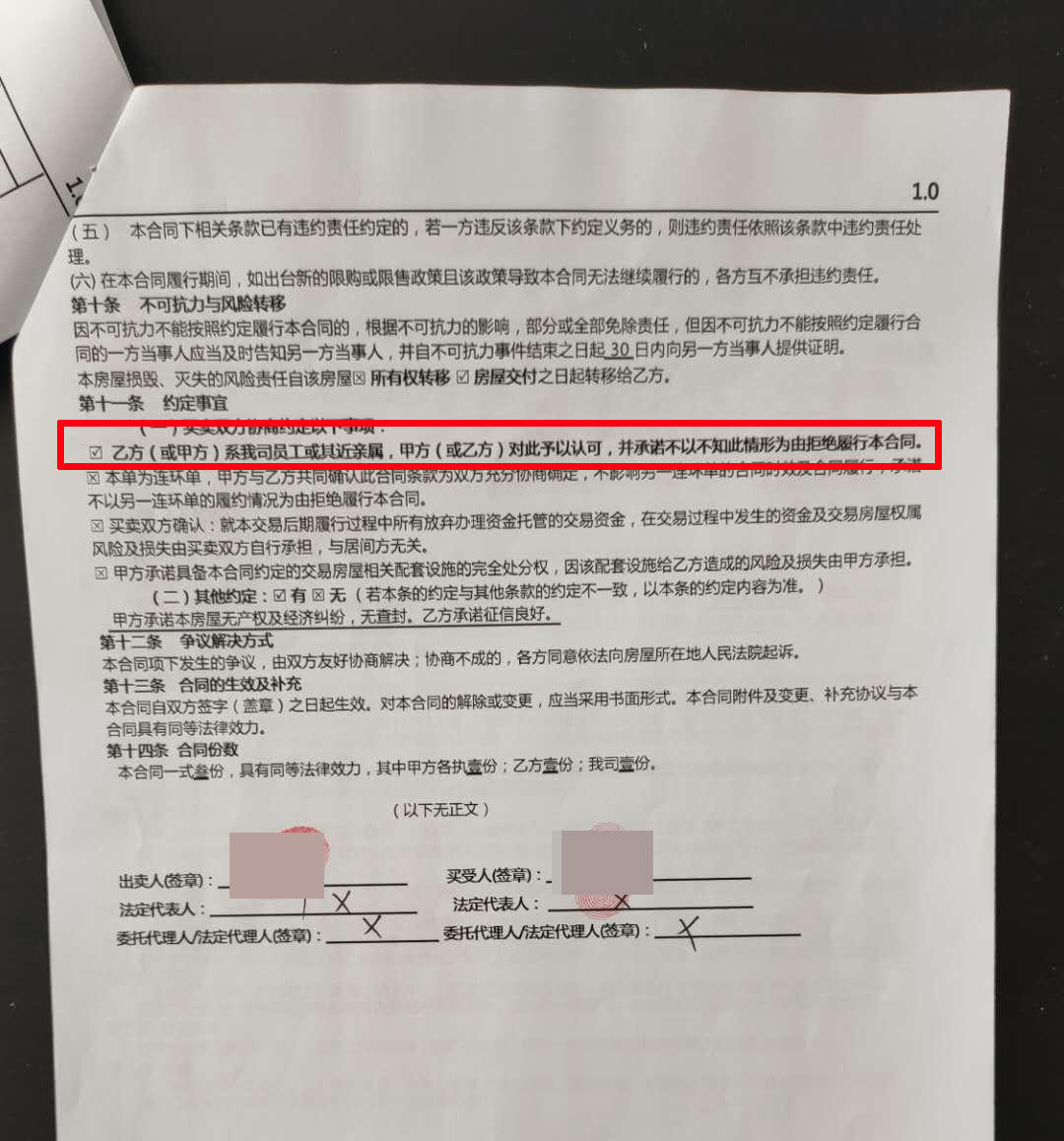 在签订合同的时候,我记得当时中介是带有选择性地把一些关键点告诉我们,比如房屋价格、贷款方式等等,双方就签字了。现在看来,这里风险实在是太高了,中介当时就是避开了一些看似不重要的信息,但是实际很重要的,比如买家的信用情况,直到后来回来看合同时,我突然发现,合同中有一条关于买家身份的条款,而且前面打了勾,敢情买房子这人就是一中介,后来我猜测,这个购房的人应该是看到我的房子和报价后,感觉有炒房空间于是准备买了再卖(当时交流时,买家说首付款是用第一套房子抵押出来的。)说心里话,看到这条心里不膈应那是不可能的,不过既然合同签了,只要能成交就行,结果事远远没这么简单。