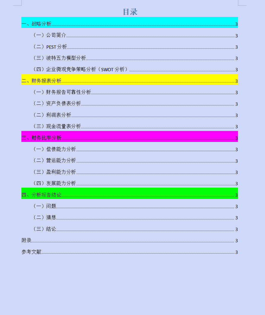 共分为四大方面,分别是战略分析、财务报表分析、财务比率分析、分析报告结论