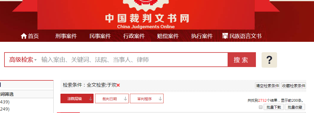 我们就用普通搜索,搜索山东聊城市的"侮母案"中的"于欢",在搜索框中输入"于欢",