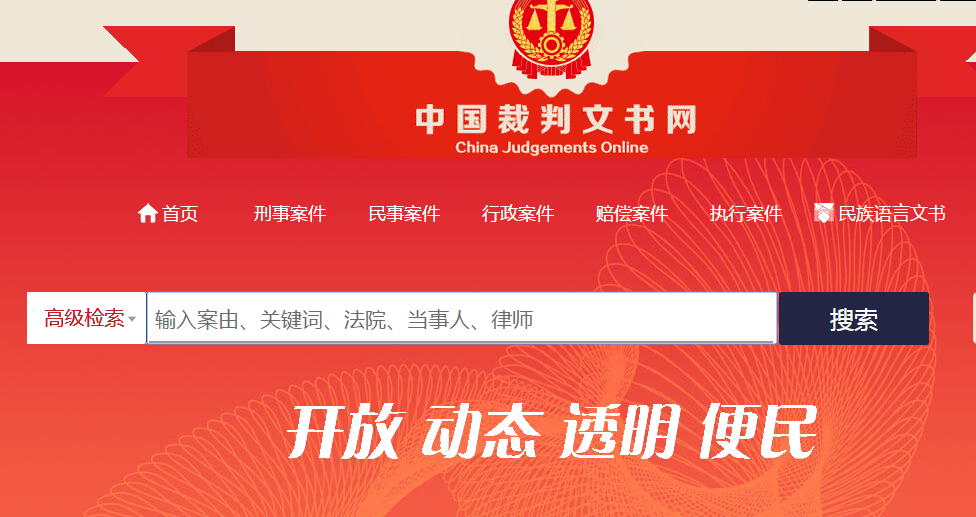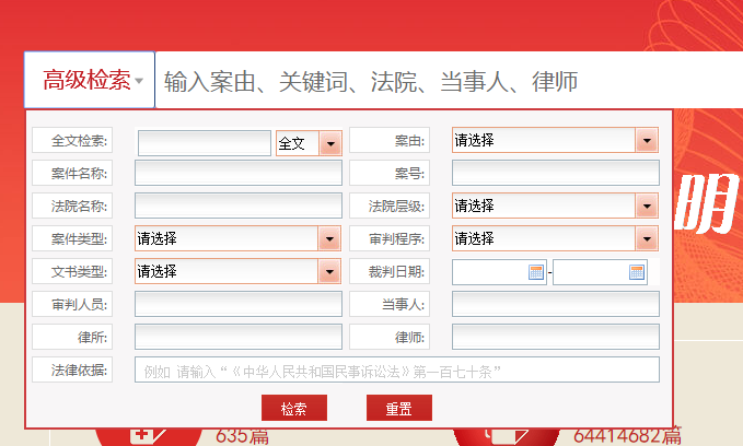 如上图所示,我们可以输入案由、关键词、法院、当事人、律师等等,也可以使用高级搜索,如下图所示: