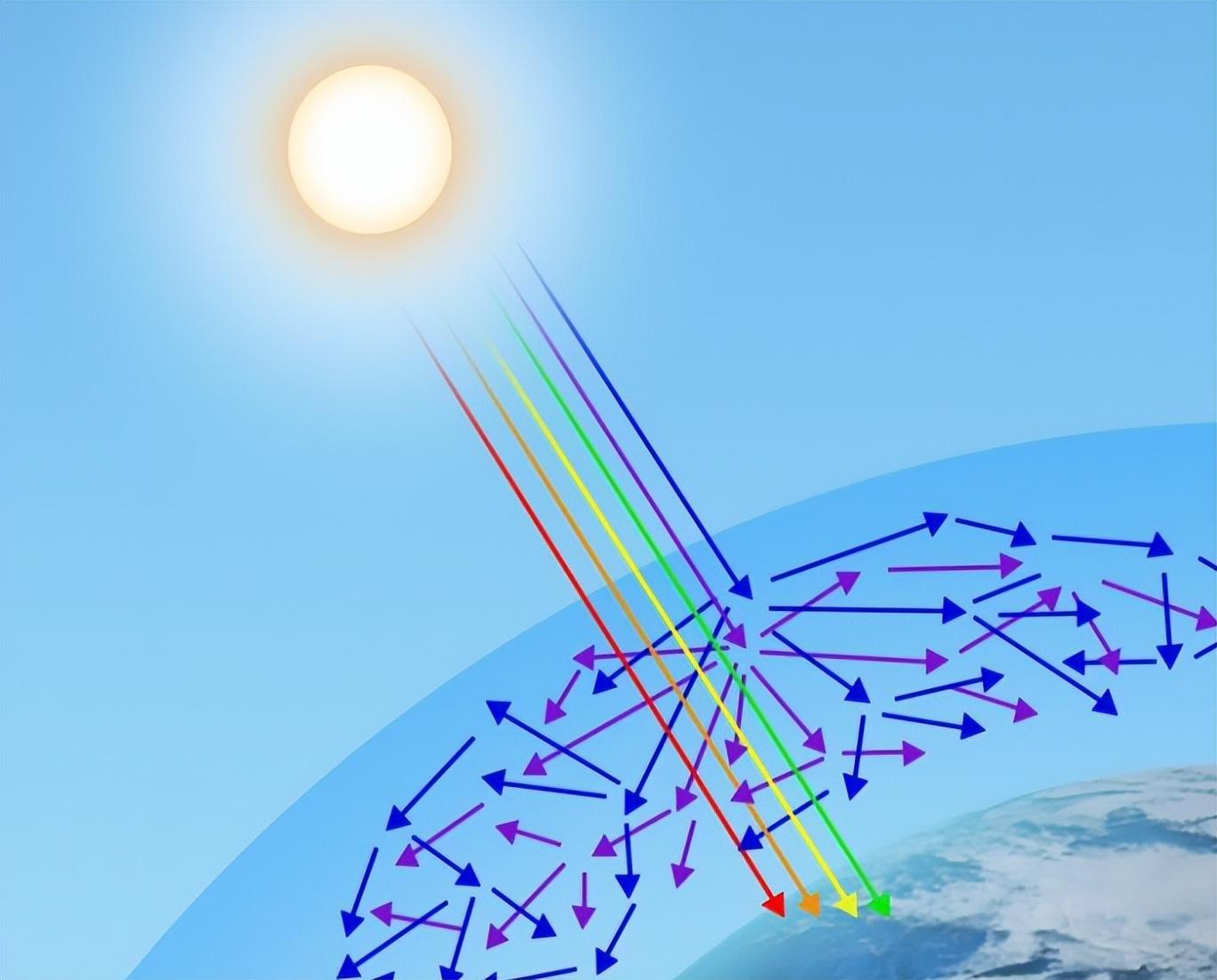 地球有大气层,大气层中有各种粒子、灰尘和水蒸气等,当太阳光经过大气层时,光会与大气层中的粒子发生瑞利散射,其中光的波长越短,散射能力就越长。