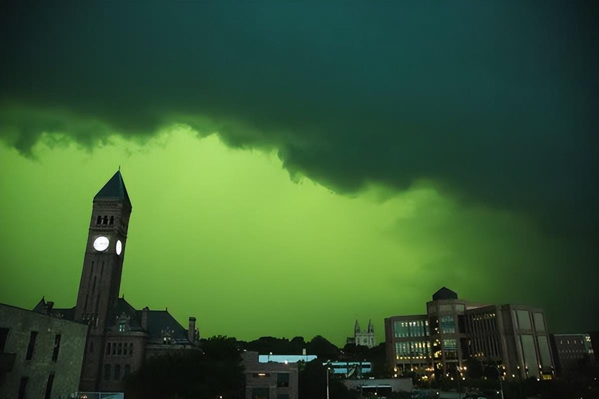 一般绿色天空出现时,往往意味着强对流非常旺盛,如果可以,尽量待在安全的地方不要外出。