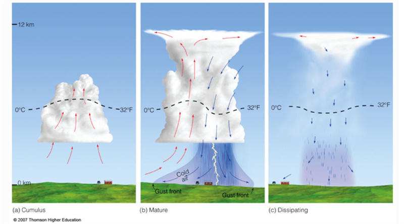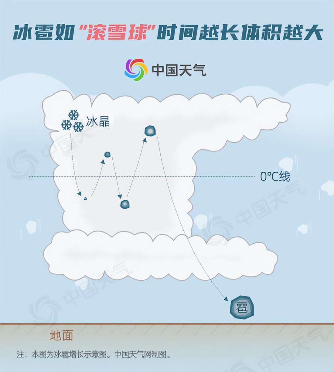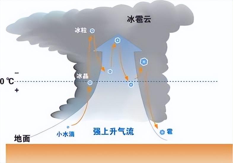 当小水滴或者小冰晶降落时,又会被更强的上升气流推到更高的高空中,凝结成更大的小水滴,如果上升气流足够强烈的话,还会形成冰雹,原因是冰雹胚胎会在强烈上升气流的作用下抬升,和周围的过冷水凝结在一起,形成冰雹,如此多次之后冰雹就会“长大”,直到强对流天气再也拖不动冰雹,冰雹才会砸落在地面。