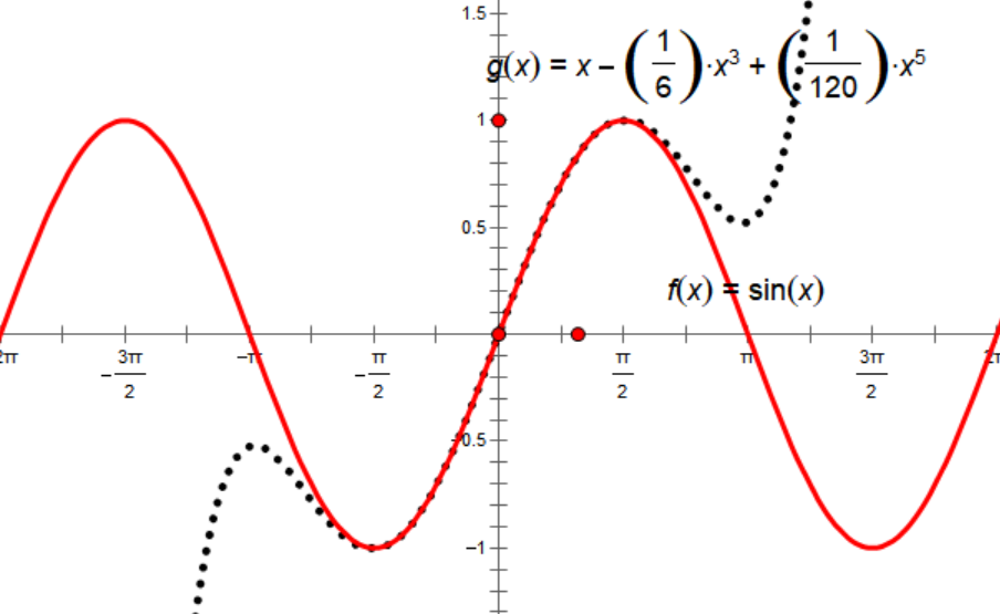 当然如果我们取的级数展开式的项数越多,得到的正弦值也就越精确。而结合当代计算机的强大功能,我们可以快速计算任意角度的足够精确的正弦值。泰勒级数的功能之强大、过程之简洁实在让人震撼!