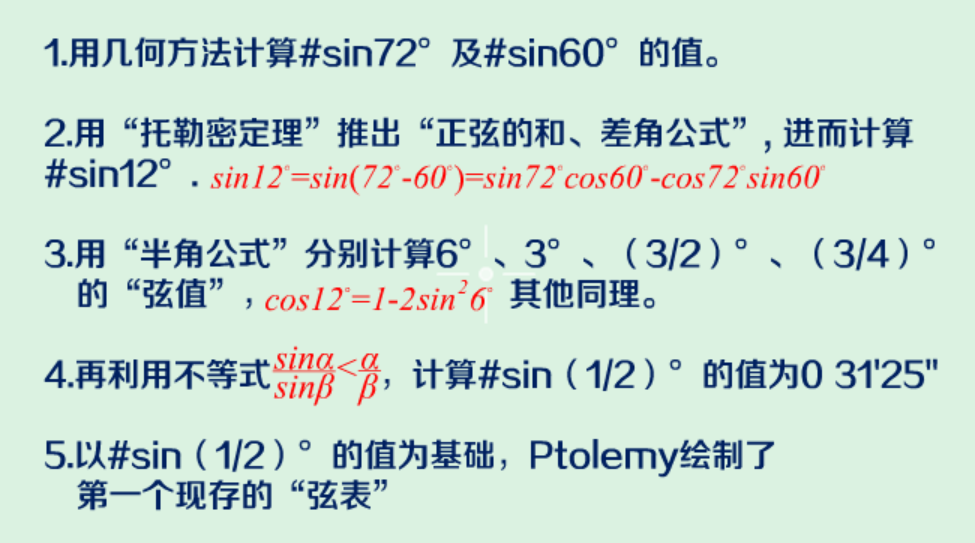 Ptolemy绘制的“弦表”建立在几何——尤其是托勒密定理的基础上,并且已经有了等价于现代“正弦的和、差公式”、“半角公式”等三角公式,更难能可贵的是大胆的使用了“不等式”来逼近函数值。后世的印度、阿拉伯数学家对他的方法、成就做了继承和发展,逐步演变成现在比较成熟的“三角学”。