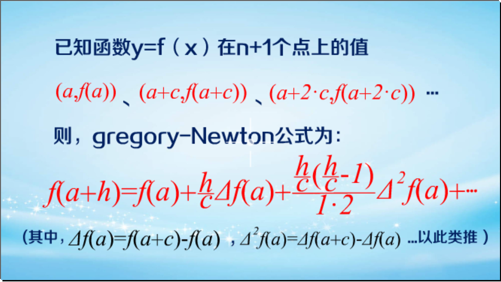 当然,在欧洲“牛顿插值公式”的发现不只属于Newton,同时期的格雷戈里(gregory)、莱布尼茨( Leibniz)也享有独立的发明权。为了便于大家快速理解这个公式的用途和来由,我们使用现代符号来表示: