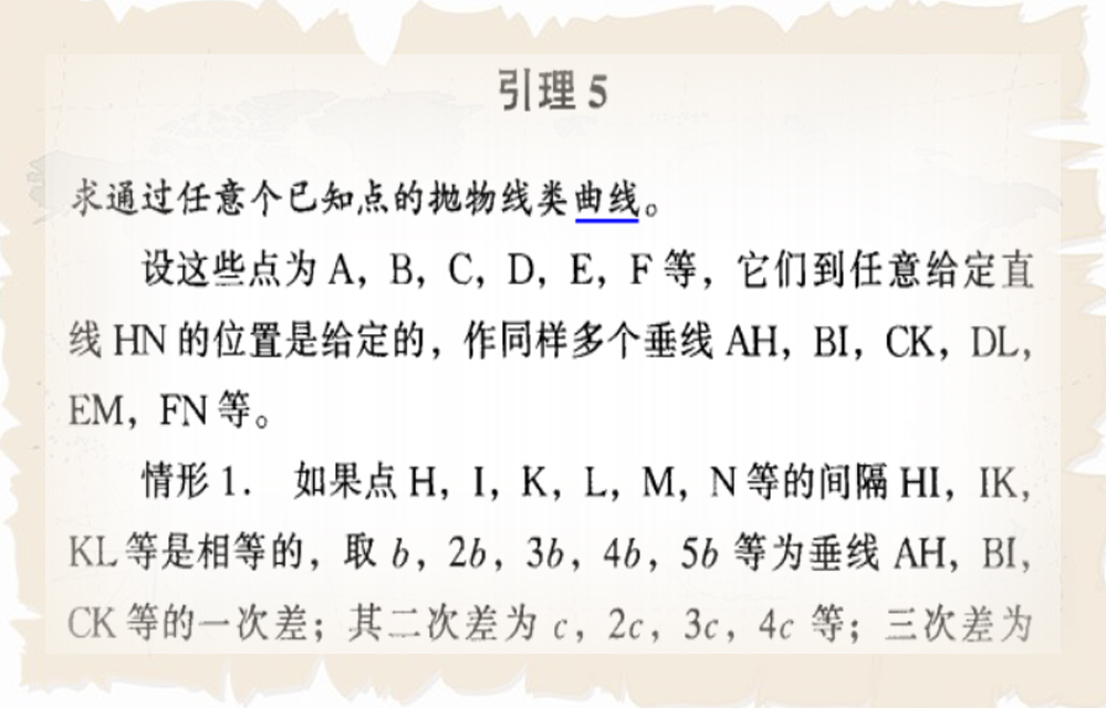 但是此书还有一个对微积分影响深远的发现,大家却未必知晓。在《原理》第三篇的引理五“求通过任意个点的抛物线类曲线”中,Newton以几何的形式给出、并简单证明了这个发现——“牛顿插值公式”(Newton interpolation formula)。