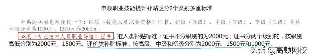 另外58项《专业技术人员职业资格》证书,包含准入类和水平评价类证书,准入类证书不分级别是2000元的补贴;证书分两个级别的,按级别高低分别为2000元、1500元。评价类补贴标准:按高级、中级和初级分别为2000元、1500元和1000元。(会计职称类证书属于评价类证书,以下会说明)