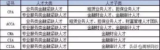 根据《上海金融领域“十三五”紧缺人才开发目录》,持有CPA、ACCA、CMA、CIA、CISA等会计证书的人才都是“十三五”金融人才规划的开发对象。