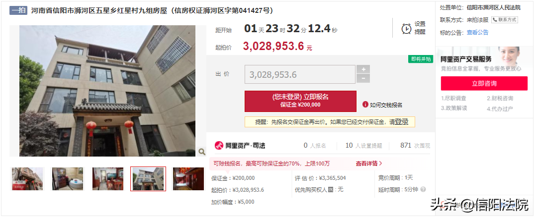 起拍价:302.89万元,保证金:20万元,增价幅度:5000元。