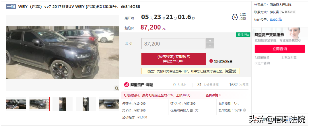 起拍价:8.72万元,保证金:1万元,增价幅度:1000元。