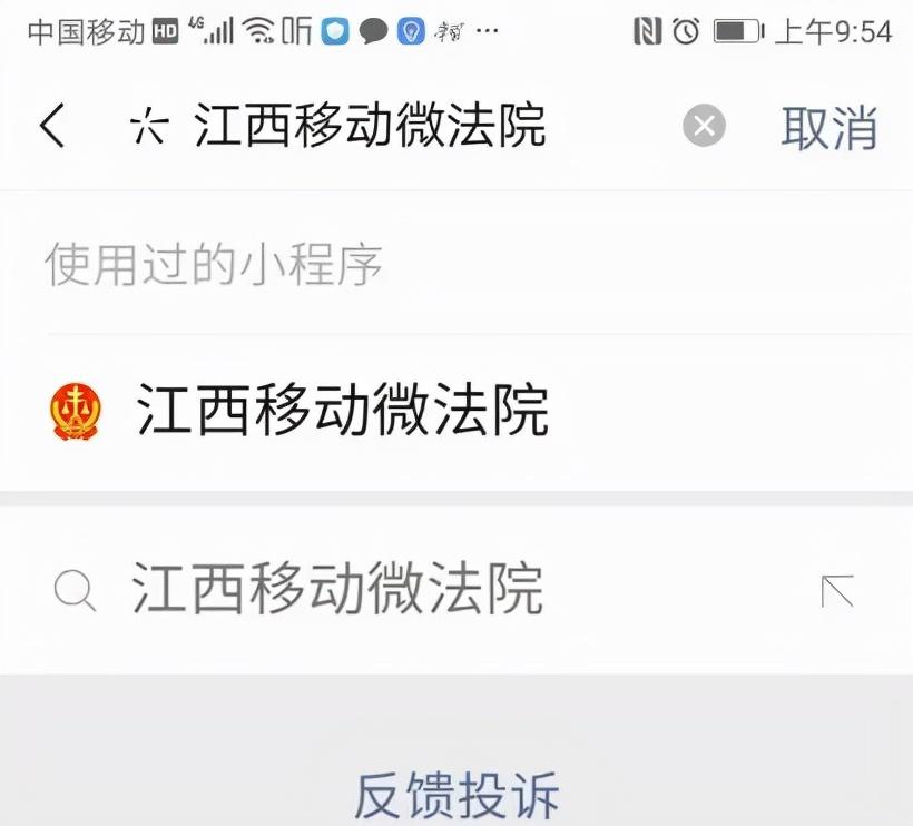 1、进入微信-发现-小程序,点击右上角搜索图标,搜索“江西移动微法院”,进入江西移动微法院小程序。