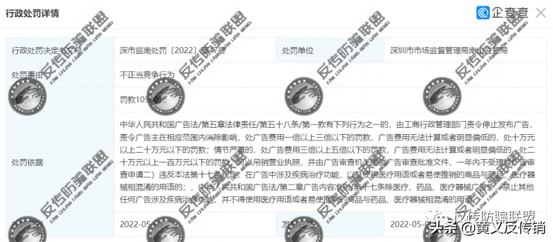 据企查查显示,今年5月5日,深圳市监局对荣格虚假宣传做出行政处罚,罚款金额1.05万元,处罚书显示,荣格科技的“柏力宝膜养TM压片糖果”、“牡蛎钛压片糖果”、“芦荟果粒”三款产品属性为食品,却宣传其具有保健功能,具体广告语为:“具有抗病毒、提高免疫力的作用”、“提高人体免疫调节功能。”