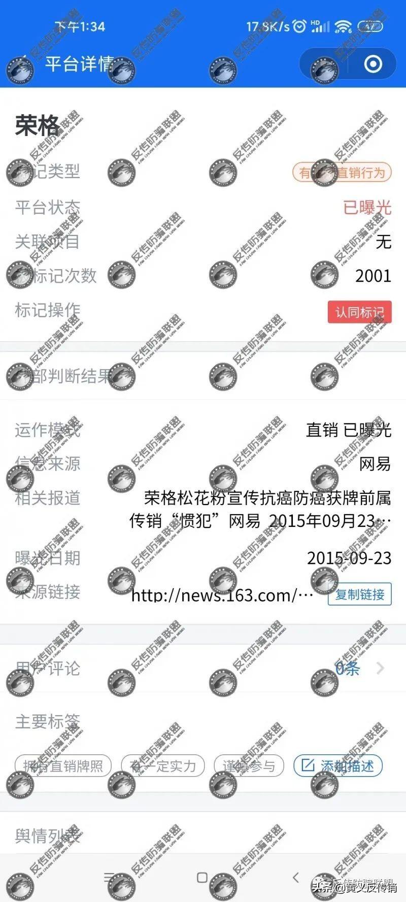 据腾讯平台的灵鲲金融风险查询举报中心显示,荣格的标记类型为“有违规直销行为”,标记次数达2001次,平台状态为“已曝光”状态,早在2015年9月就已有过“荣格涉嫌传销”的相关报道,主要标签有“谨慎参与”等字样。
