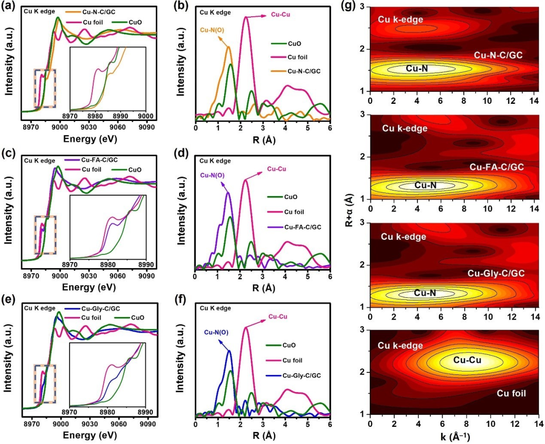 如图2所示,XANES光谱表明Cu−N−C/GC 表现出与 CuO 相似的Cu K边光谱,确定Cu的价态接近+2。同样,Cu−FA−C/GC和Cu−Gly−C/GC的Cu价态的K边光谱均为小于+2的正值。也没有观察到属于 CuO典型四方结构的特征峰,表明不存在 CuO 纳米颗粒。此外,8977 eV处的前边缘峰归因于偶极禁止的1s到3d电子跃迁,代表二价Cu的信号。EXAFS表明大约1.5 Å处的主峰归因于Cu−N键的散射路径。Cu−Cu键的缺失进一步证明了Cu物种以原子分散态的形式存在,与HAADF−STEM结果很好地吻合。小波变换 (WT) 在4 Å−1附近的最大强度进一步证明了三个样品中的Cu−N配位结构。