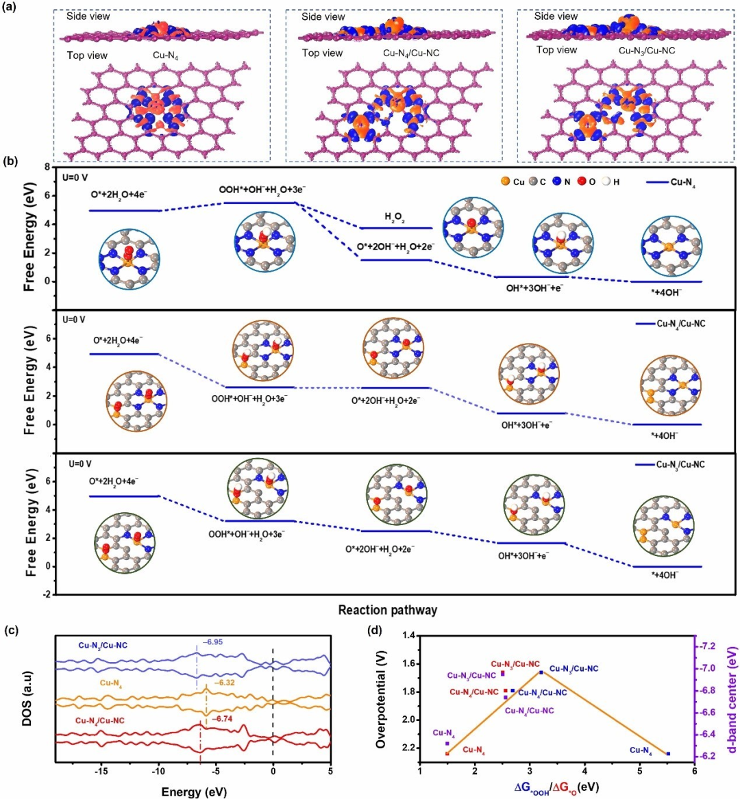 3、原位同步辐射结合理论计算结果表明,在电催化过程中发生从初始的Cu−N4到Cu−N4/Cu–NC和随后Cu−N3/Cu–NC的重构现象,这种连续的结构变化能够逐渐调节中心金属的d带中心,平衡*OOH和*O中间体的Gibbs自由能。当Cu−NC和Cu−N4或Cu−N3共存时,由于单原子与纳米团簇之间的协同效应,RDS的势垒可以进一步降低。因此,这种连续的演化可以平衡每一步的能量势垒值,降低过电位,促进ORR活性。