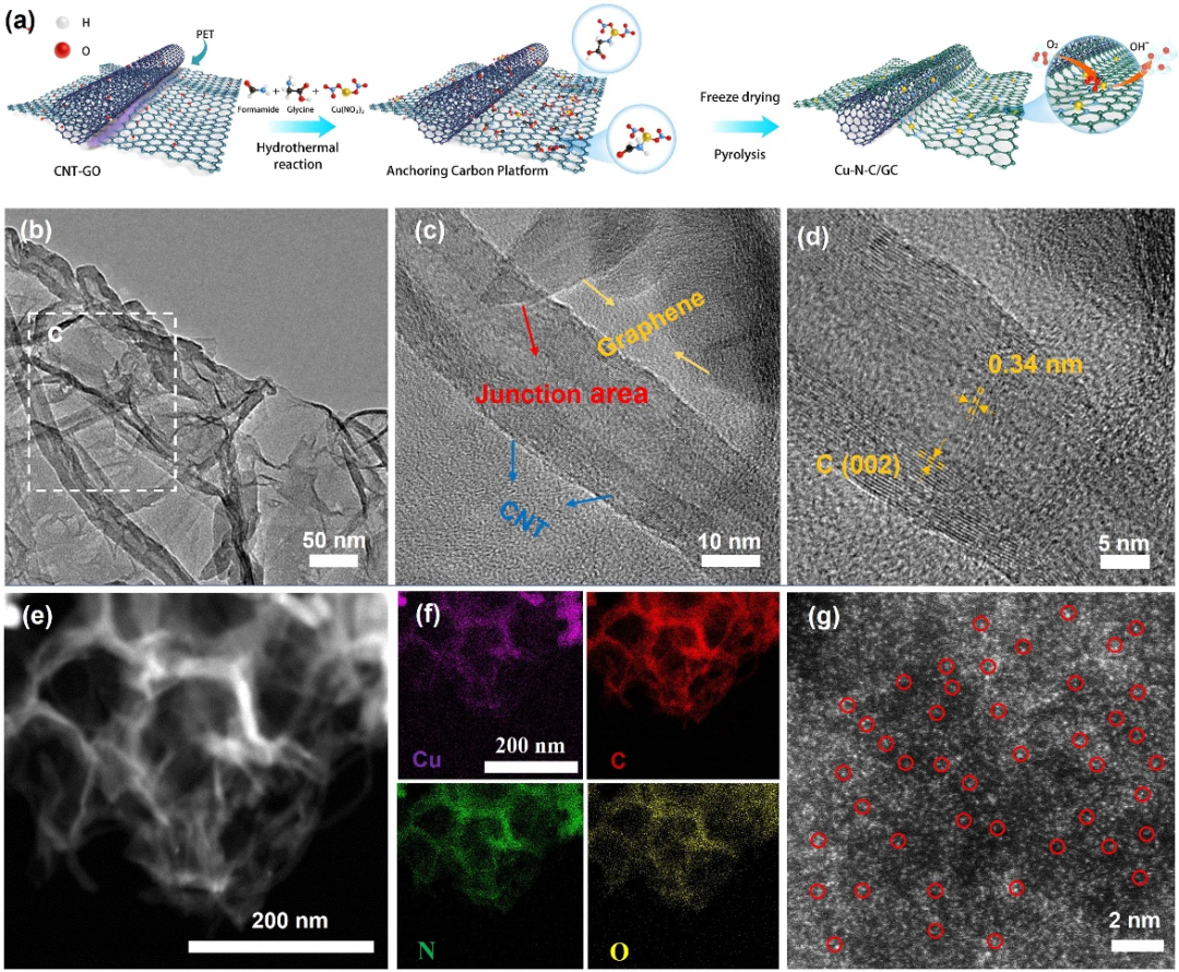 首先,用聚乙烯亚胺(PEI)对氧化石墨(GO)进行改性,再与碳纳米管(CNTs)形成3D网络结构。随后,将甲酰胺和甘氨酸的双氮源锚定在 GO-PEI-CNTs载体上并与0.9 mmol Cu2+进行配位。最后,经过冷冻干燥在900 ℃下热解,得到Cu−N−C/GC。甲酰胺和甘氨酸可以通过缩合反应形成环状碳氮分子结构,为金属离子提供丰富的配位点,有效防止热解过程中金属原子的迁移和团聚从而使Cu单原子均匀分散在碳载体中。如图1所示,SEM、TEM和STEM图片没有观测到粒子,球差电镜表明Cu以单原子的形式存在。
