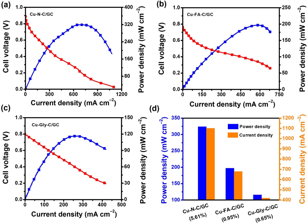 为了探索Cu−N−C/GC在燃料电池中的实际应用,将其作为阴极材料组装AEMFC。在 60 ℃的标准1.0 bar H2/O2下,催化剂Cu−N−C/GC负载量为2.5 mg cm−2, 其开路电压(OCV)为0.90 V。此外,基于 Cu−N−C/GC 的AEMFC在 0.5 V时可产生320 mA cm-2的电流密度,在0.1 V时可产生 927 mA cm-2 的电流密度,远高于所报道的基于Cu SAS的电流密度。基于 Cu−N−C/GC的APEFC提供324 mW cm−2的峰值功率密度,显着高于基于Cu−FA−C/GC的电池的197 mW cm−2和Cu-Gly-C/GC基于116 mW cm−2的电池。