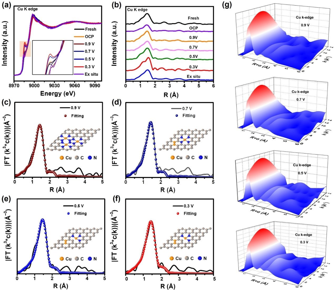 原位XANES光谱用于深入研究真实电化学环境中活性位点的起源和Cu SAS的结构变化。如图5a所示,XANES光谱在工作条件下发生了显着变化。总体而言,白线峰边缘能量在外加电位中表现出明显的负移,表明Cu的价态随着反应的进行而降低,即在阴极ORR过程中Cu2+逐渐还原为Cu+。值得注意的是,在开路电位(OCP)下收集的近边光谱与初始催化剂相似,表明当没有电位时,原始Cu−N4位点无法吸附电解质中的氧或OH−物种。因此,上述Cu2+到Cu+的动态演化是由外加电位而不是反应物吸附驱动的。当施加的电位变为0.50和0.30 V的较低电位时,更多的Cu2+被还原为Cu+。同时,可以检测到从Cu−N4到Cu−N3的结构演变,原始Cu−N4构型中四个对称的Cu−N键中有一个Cu−N键断裂,悬浮的吡啶N被质子化。