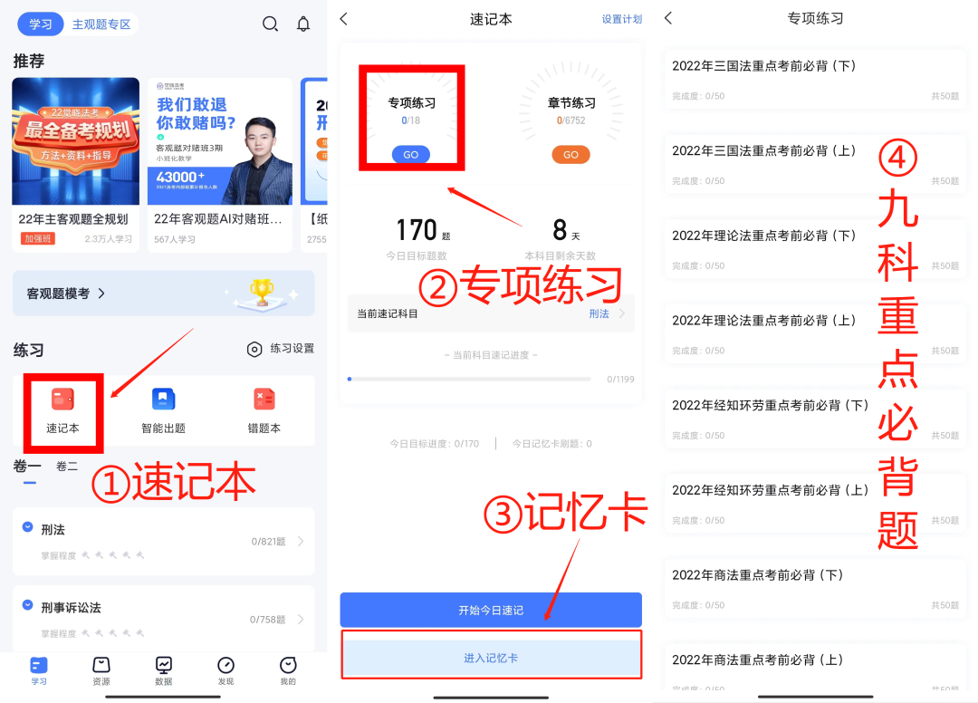 ③剩下的1/3建议刷法考速记本,是你捞分的最佳方法,一些要记的点我们都放进去了。