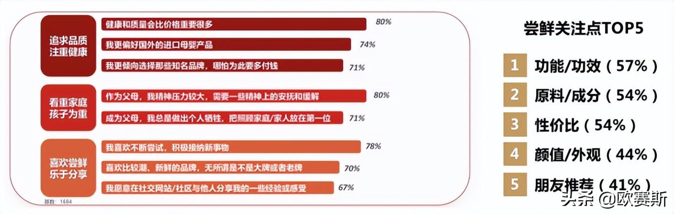 当代母婴人群以家庭视为重心,在品牌选择上偏向于选择知名品牌或进口品牌,需求功能功效、原料成分好、性价比高的产品,不盲目寻求低价,但也愿意追逐潮流去尝试新鲜的事物。