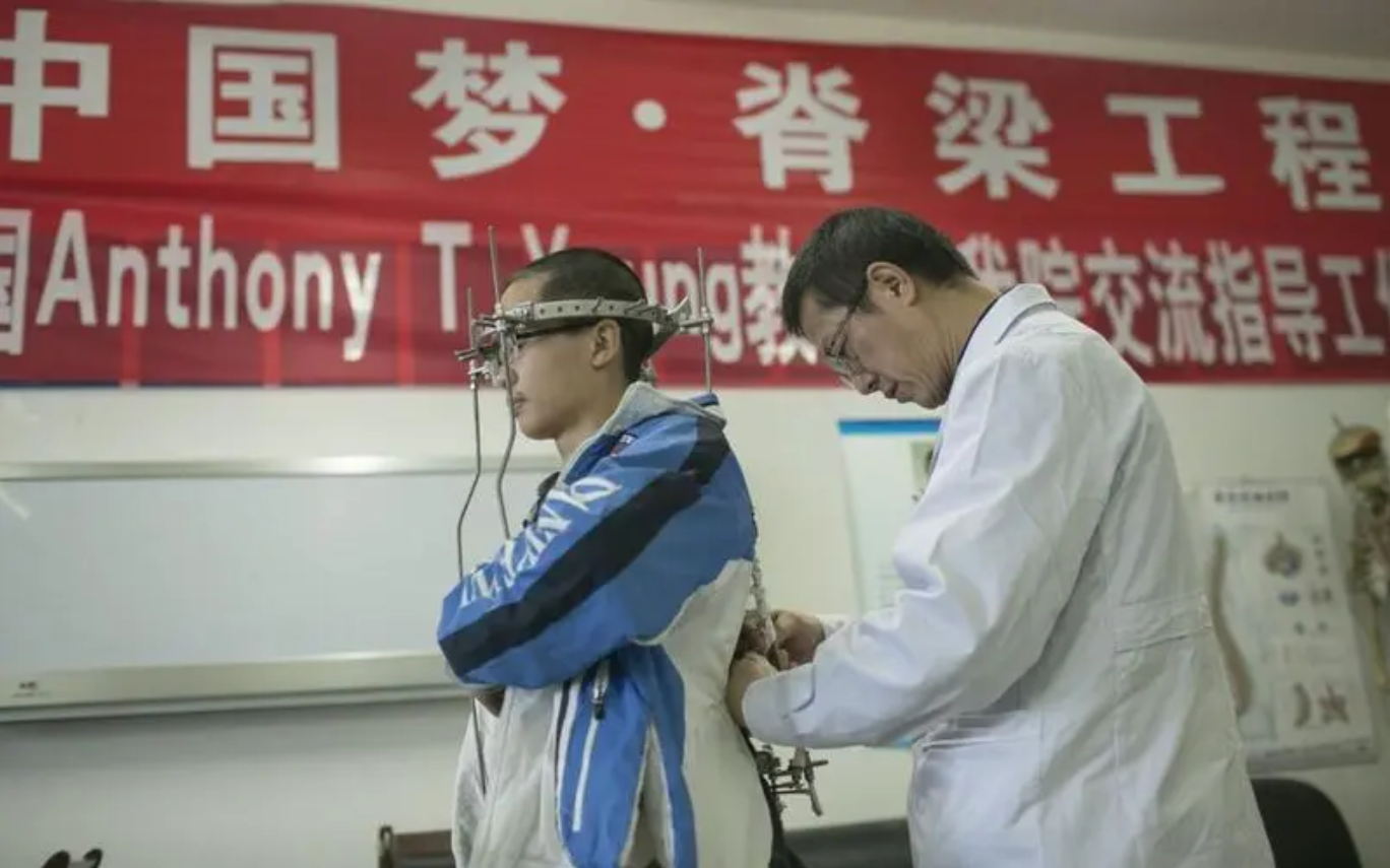 还专门设计发明了一套专门治疗重度脊柱畸形牵引的头盆环,辅助调整脊柱畸形的角度,再来进行畸形矫正手术,大大提高了成功率。