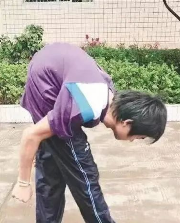 那时的他身体弯曲153度,头部紧挨着膝盖,五脏六腑在腹腔中挤在一起,无法直立行走,睡觉也只能侧着,走在人群中仿佛一个“外星人”。