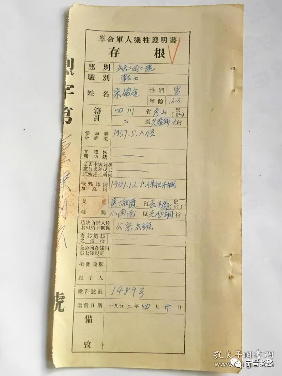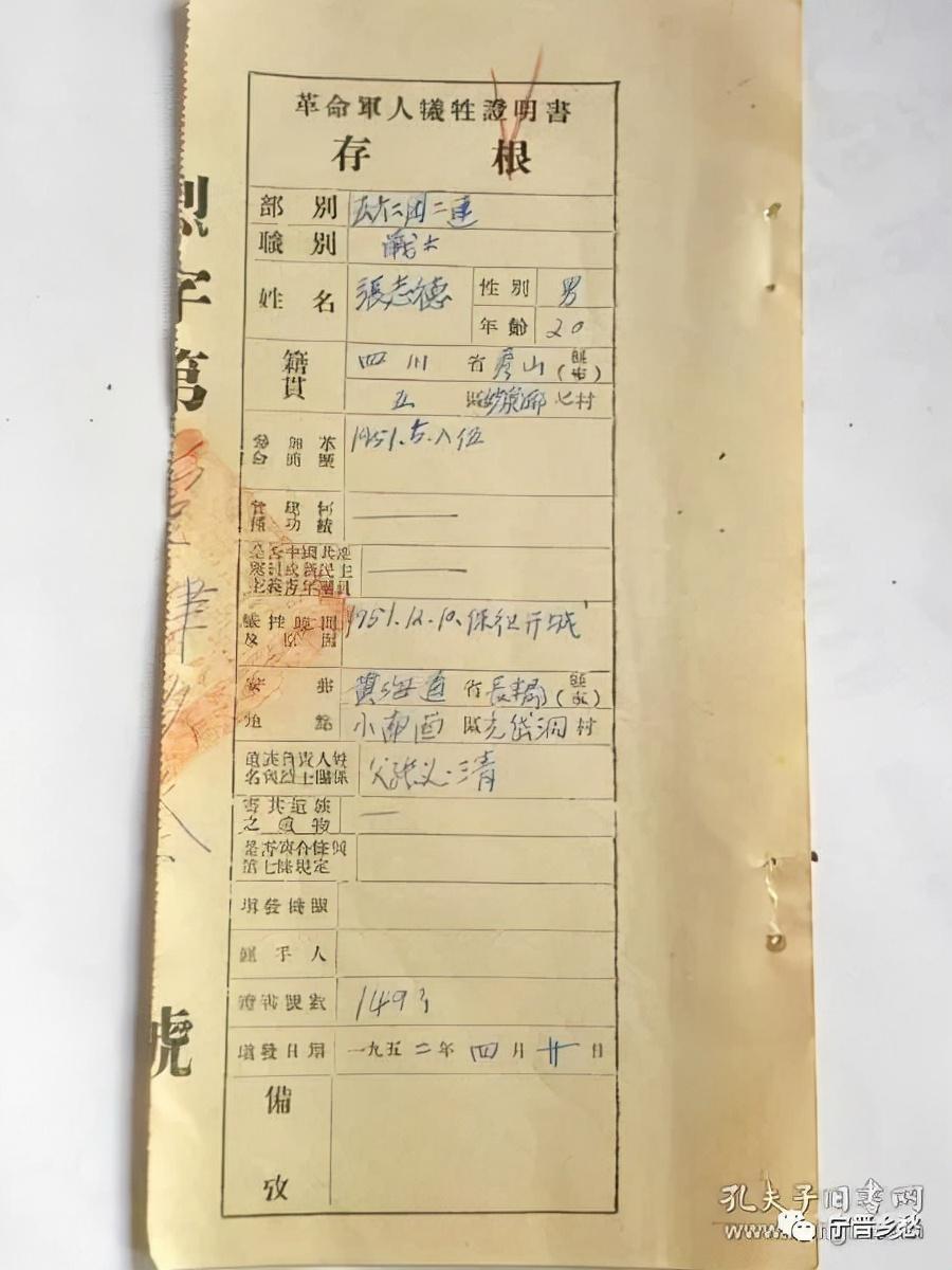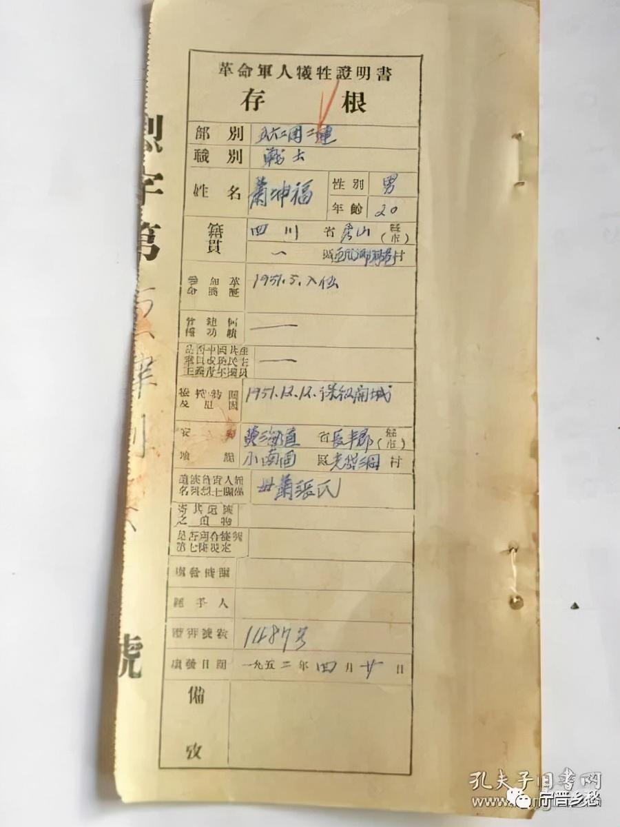 中国人民志愿军革命军人牺牲证明书存根,六十三军一八八师五六二团五连战士鲁泽高,男,22岁,秀山县石青龙村人,1951年5月入伍,1953年3月点炮炸亡牺牲。
