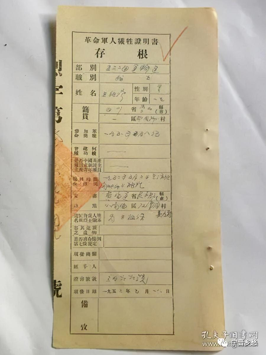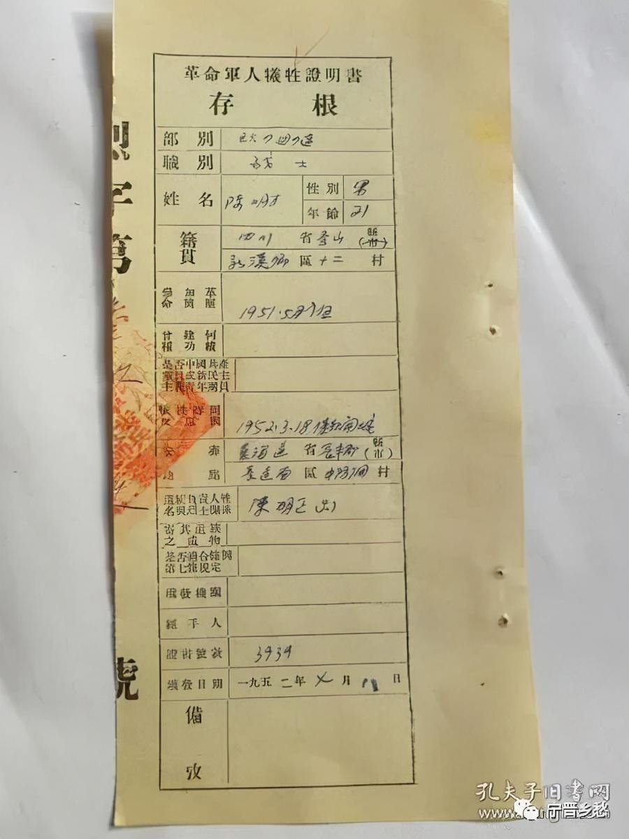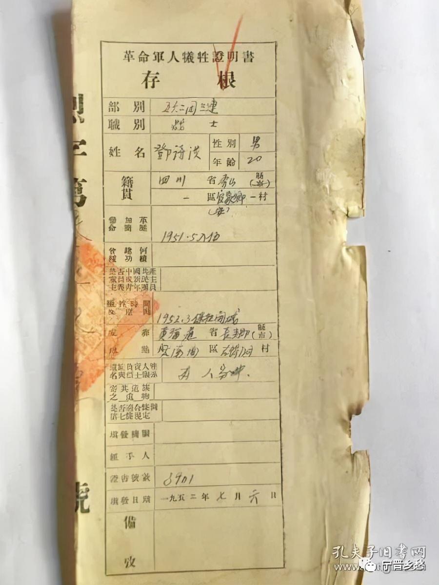中国人民志愿军革命军人牺牲证明书存根,六十三军一八八师五六二团五连战士鲁泽高,男,22岁,秀山县石青龙村人,1951年5月入伍,1953年3月点炮炸亡牺牲。